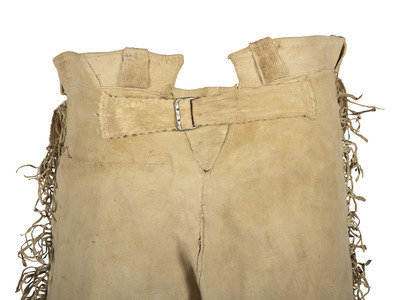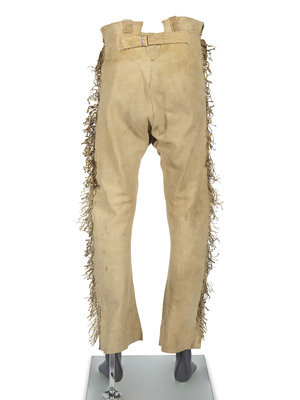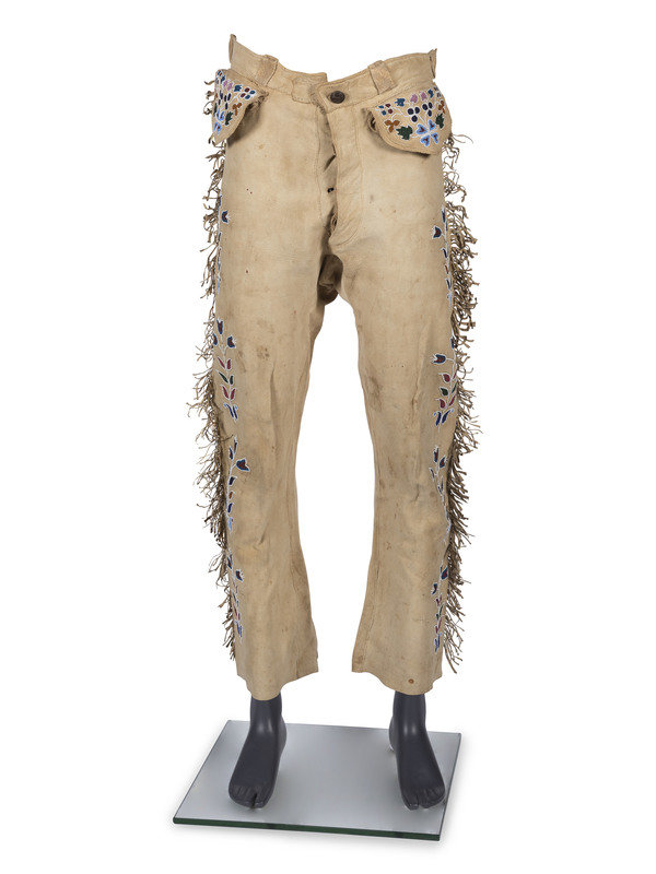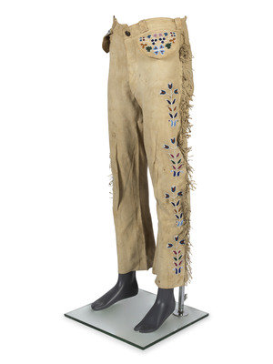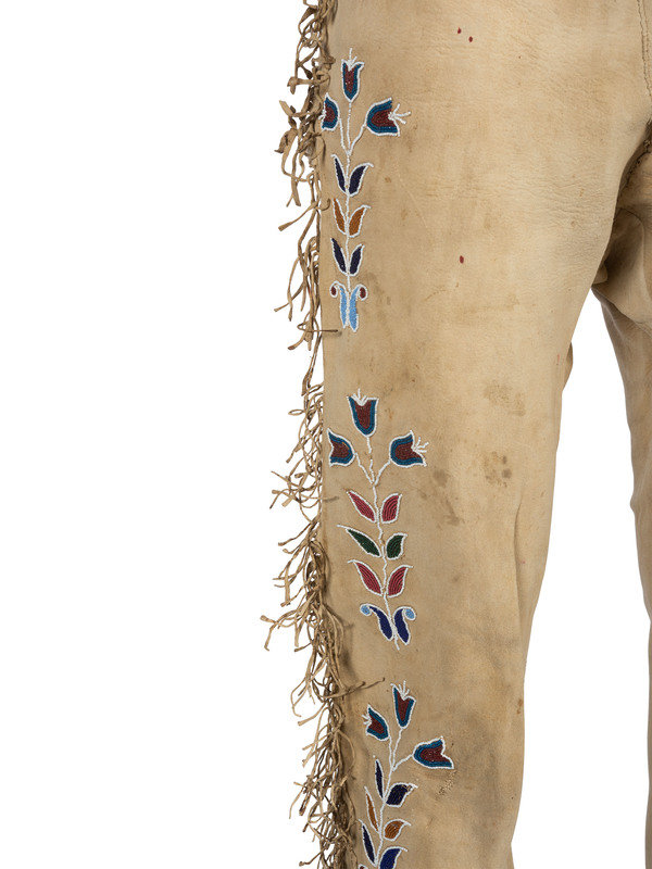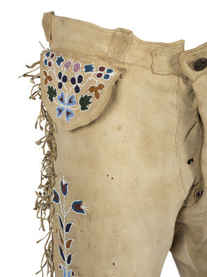sinew-sewn and beaded with white outlined floral designs; fringe along side seam; button fly
