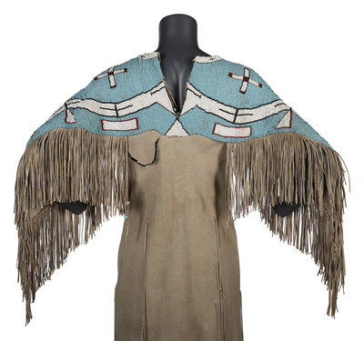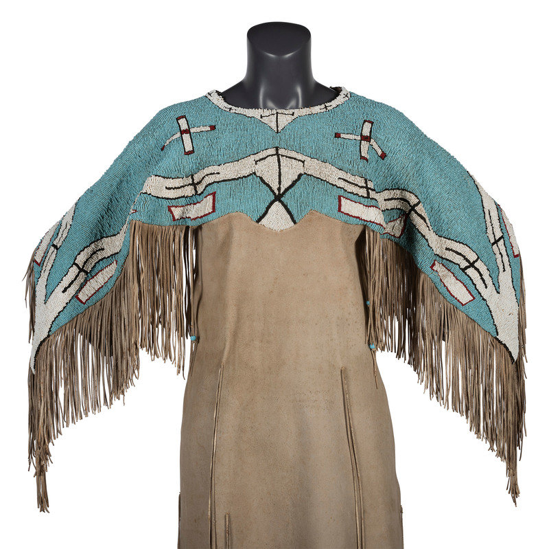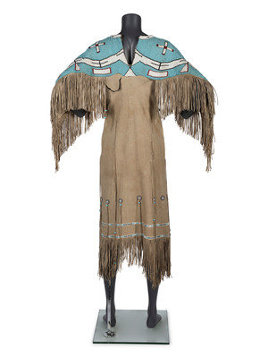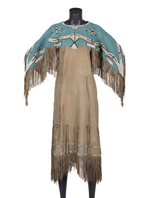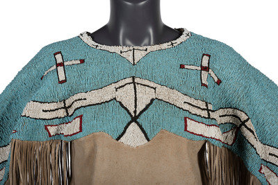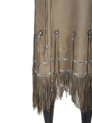 thread-sewn on commercially tanned hide; yoke decorated with large beads in colors of light blue, white, cobalt, and rose; thin fringe falls from arms and lower skirt hem