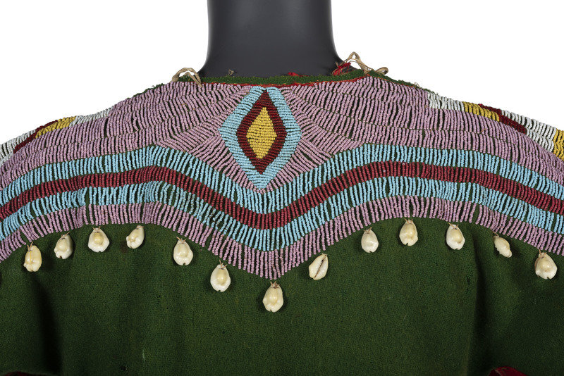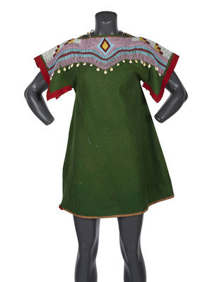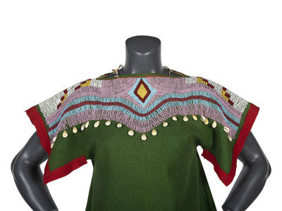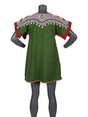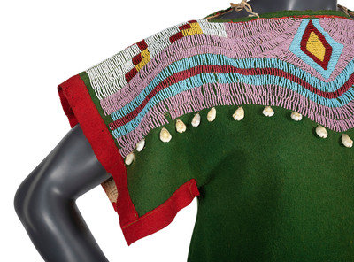 thread-sewn; with yoke beaded using colors of pink, light blue, red white-heart, rose, and yellow; a single row of cowrie shells outlines bodice; hide thong ties at shoulders