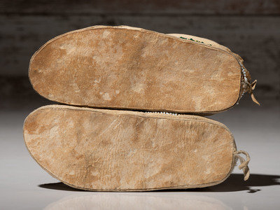 a pair of sinew-sewn on hide child's moccasins, with beaded lanes featuring bowtie motifs in colors of translucent green, yellow, and white