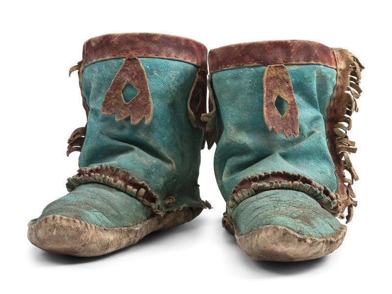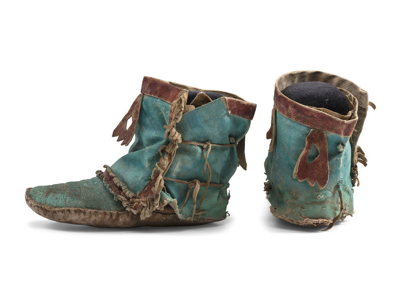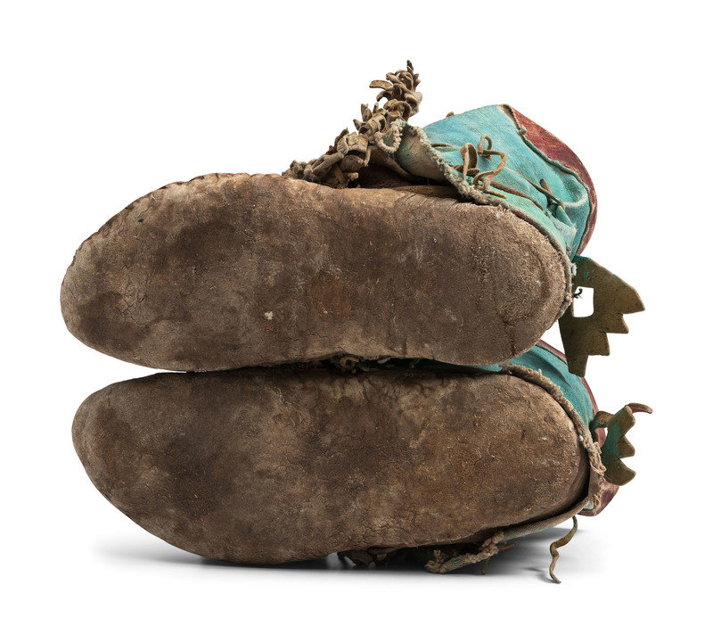 crafted with rawhide soles and hide uppers, the cuffs from a heavy canvas and lined with a thick hide; heavily coated with a teal pigment throughout and accented with a reddish-brown pigment on the tabs and edges