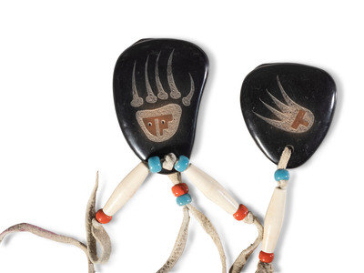a pair of braid ties, each formed with a slight curve, each attach with leather thongs decorated with plastic beads