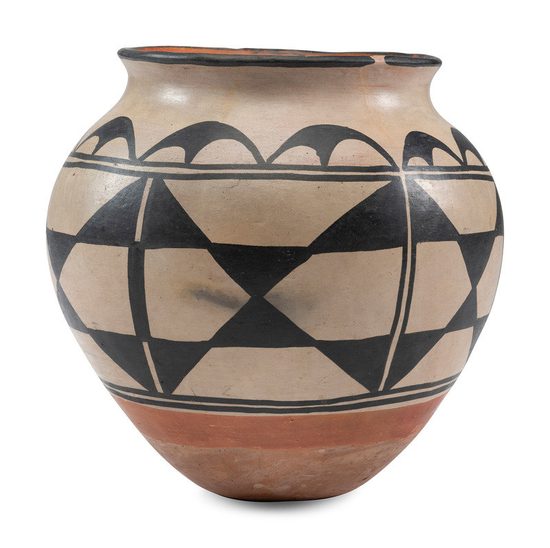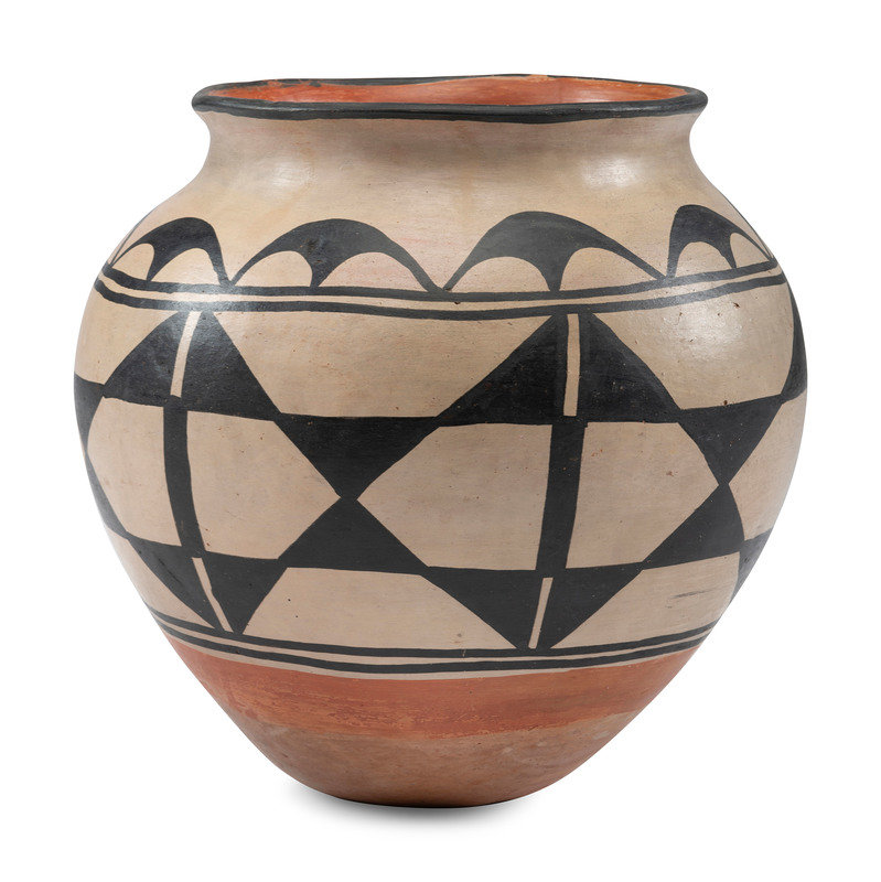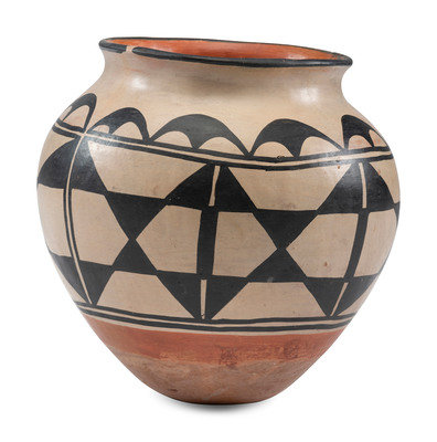 with a short neck and high shoulder; decorated with heavily blocked geometric elements; not signed