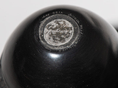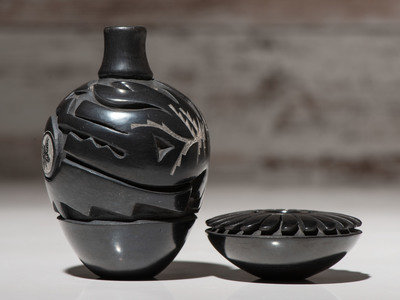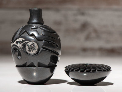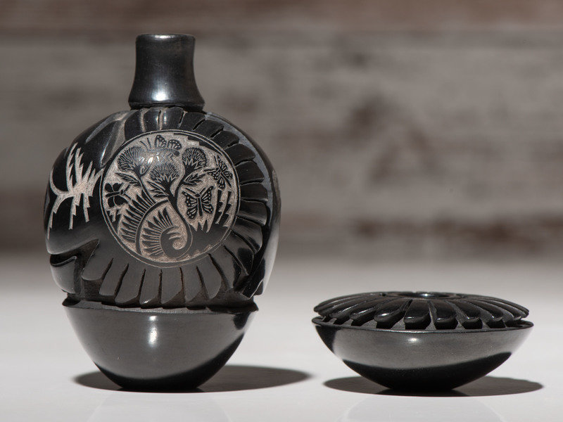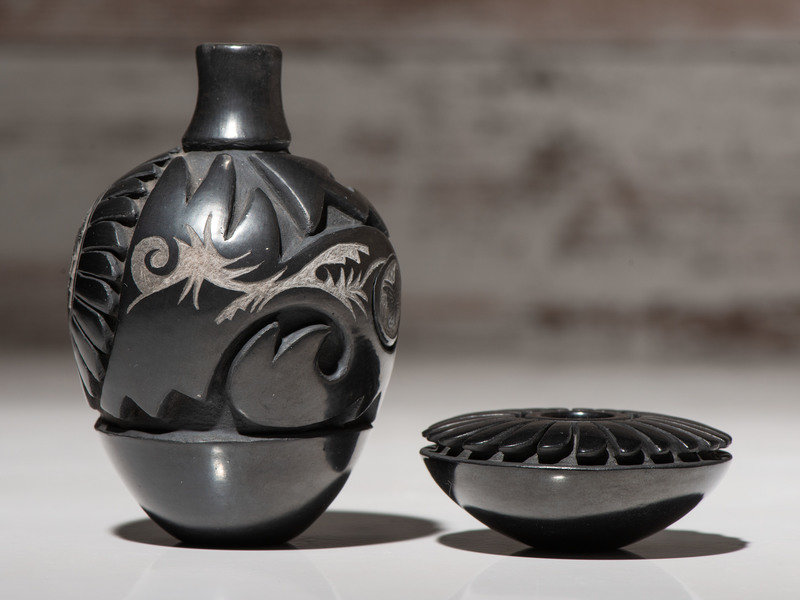 Grace Medicine Flower blackware pottery jar with sgraffito designs and bottleneck; signed on base
