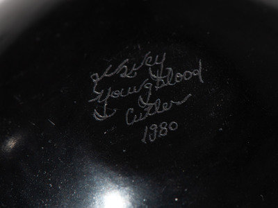 Nancy Youngblood blackware pottery seed jar with carved sun design; signed on base