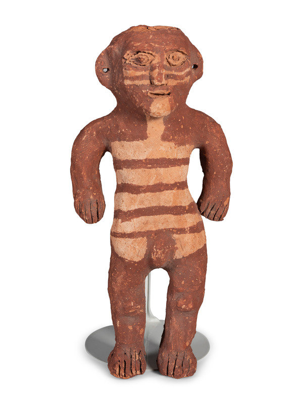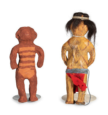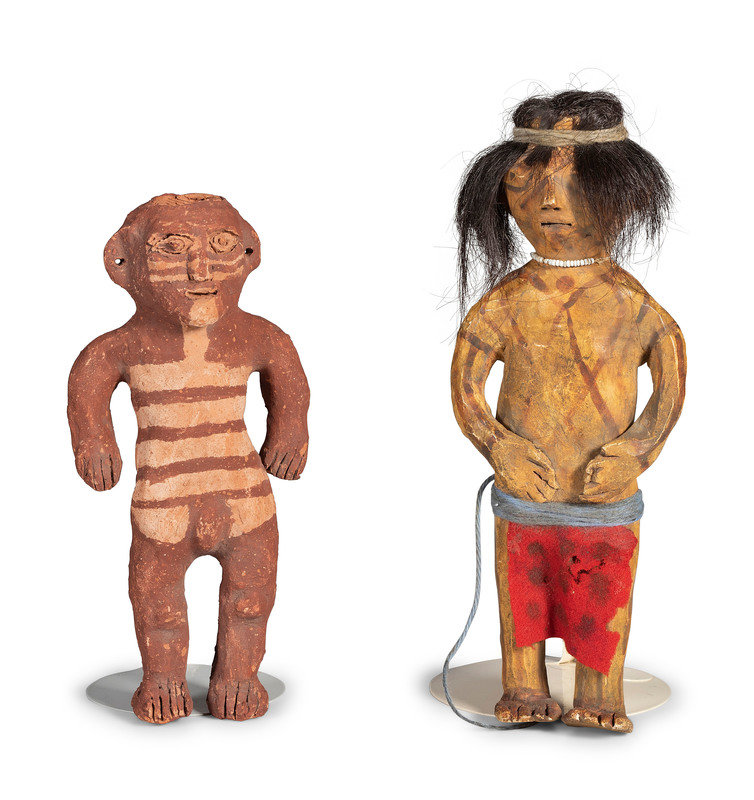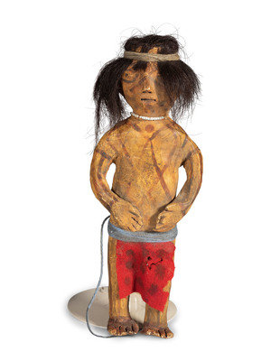 a ceramic (high fired) doll, with brown hair and red cloth breechcloth