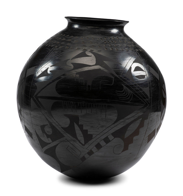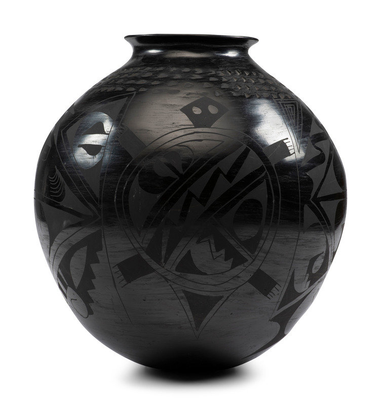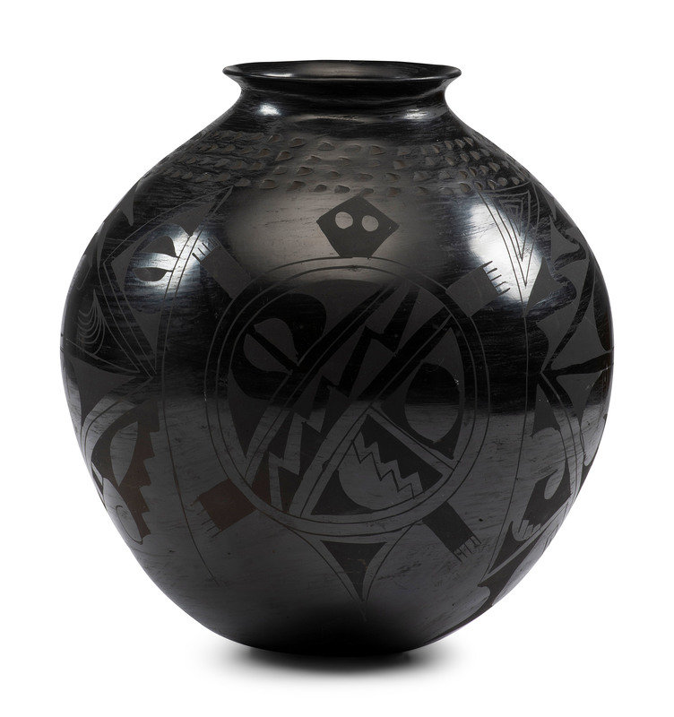 Eduardo Chevo Ortiz (attributed) black-on-black jar with geometric pattern