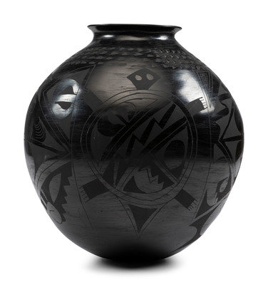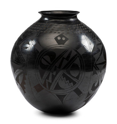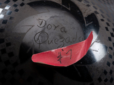 Dora Quezada black-on-black jar with checkerboard pattern; signed on base