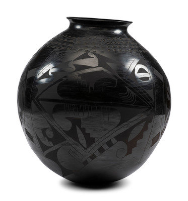 black-on-black jar; illegibly signed on base