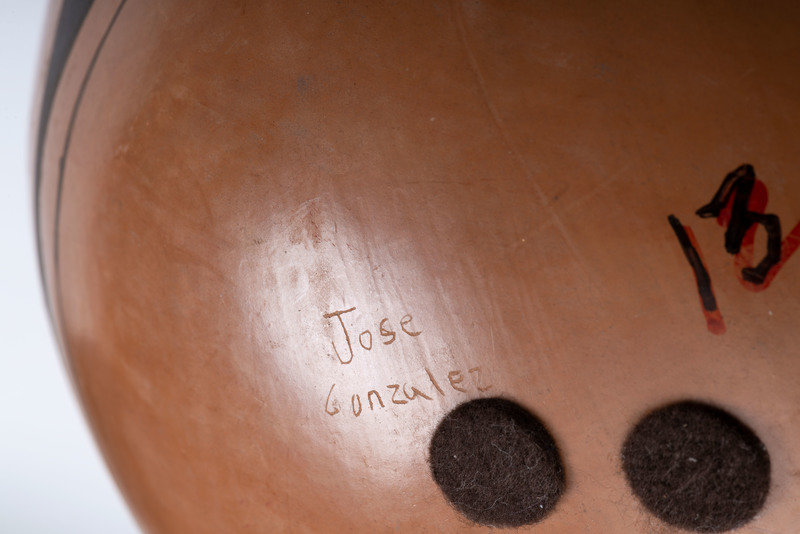 Jose Gonzalez jar with bands of geometric designs; signed on base