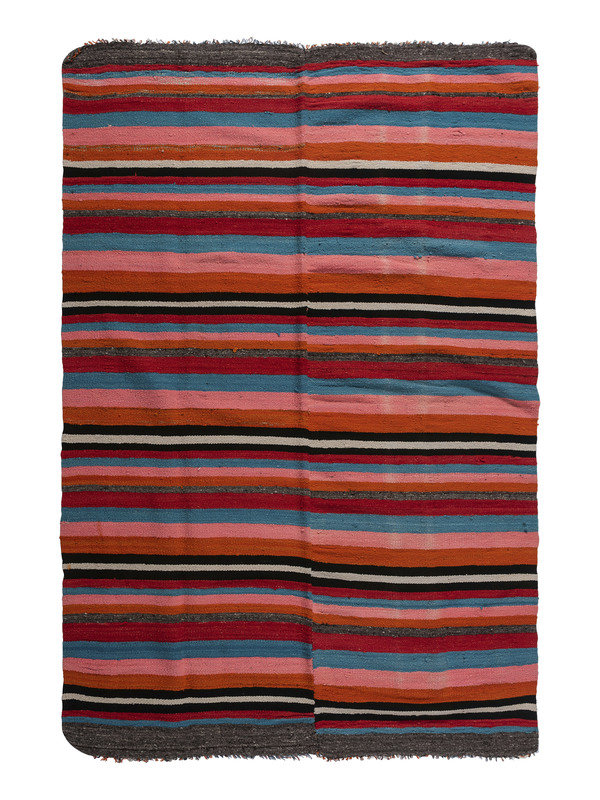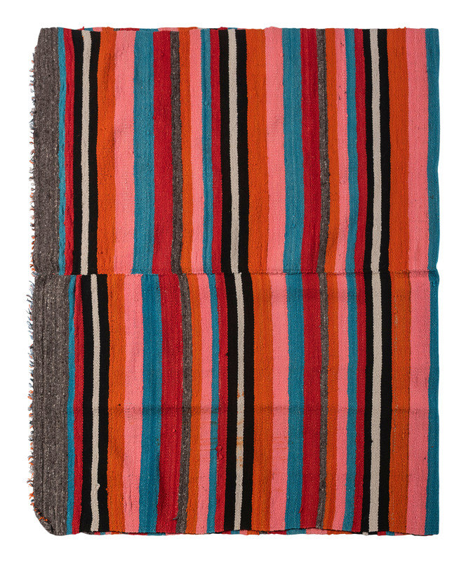 woven in two panels of gray, red, black, cream, blue, pink, orange