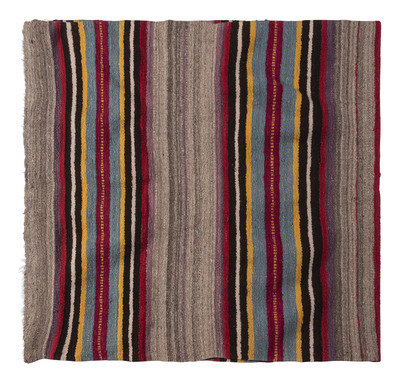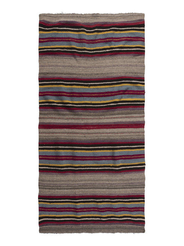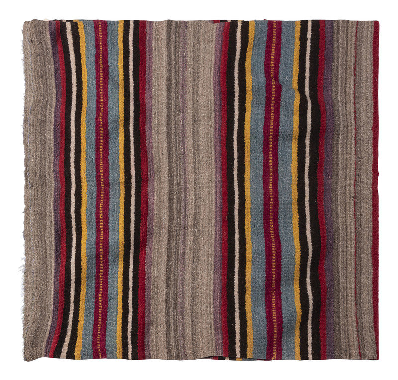 having scalloped sides and woven in colors of gray, purple, red, black, cream, yellow, blue, and pink