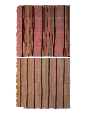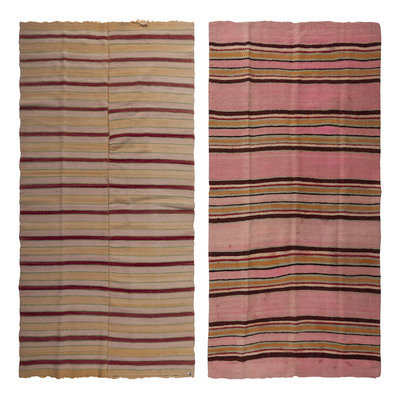 one constructed of two panels, in colors of pink, green, red, and yellow