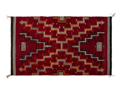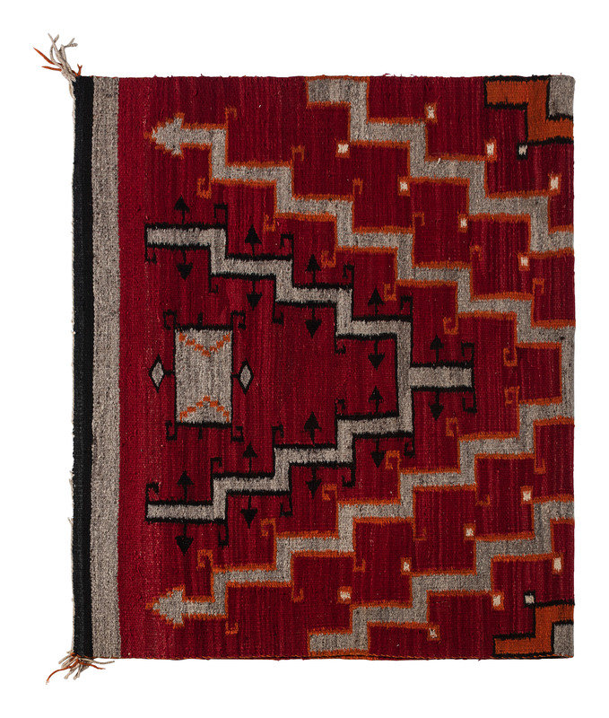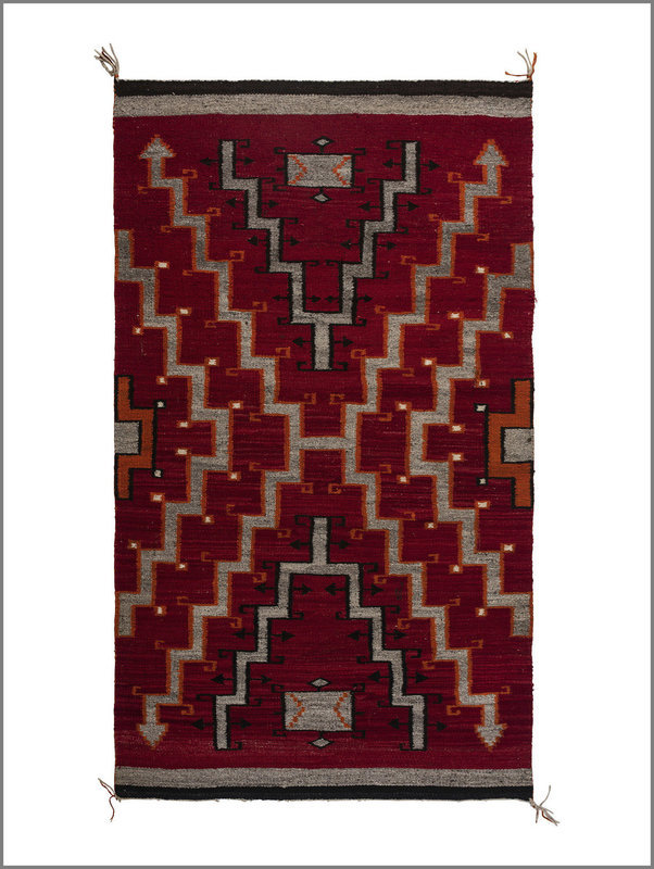 hand-spun wool, having a heavy flat weave and woven in colors of red, cream, dark brown, and orange; overall stepped zigzag pattern