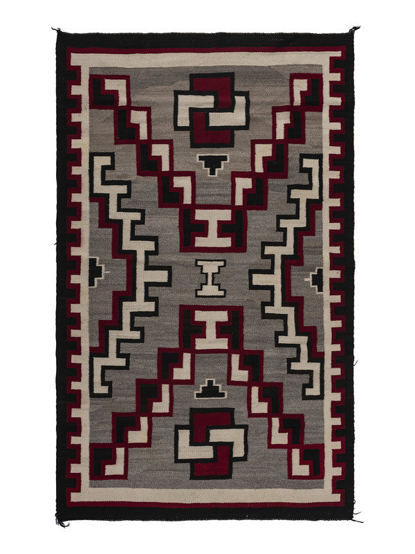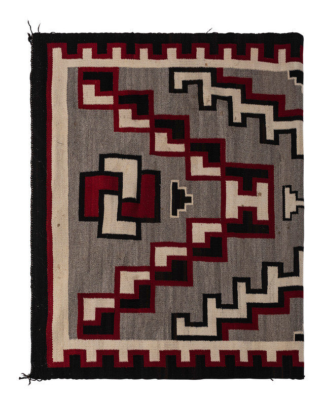flat weave and designed with fitted blocks in colors of red, black, and cream