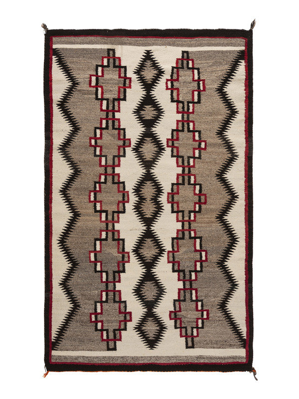 handspun wool woven using colors of gray, cream, black, and red; designed with three rows of stacked diamonds