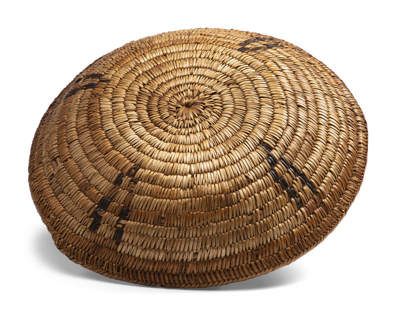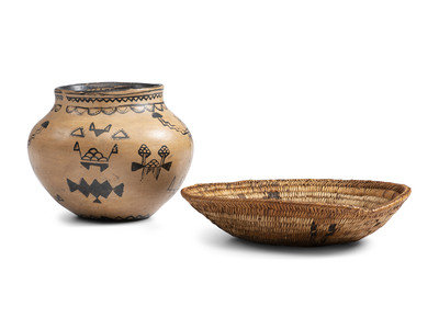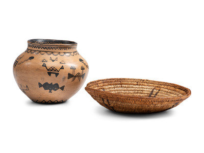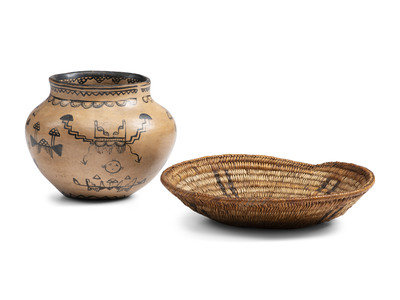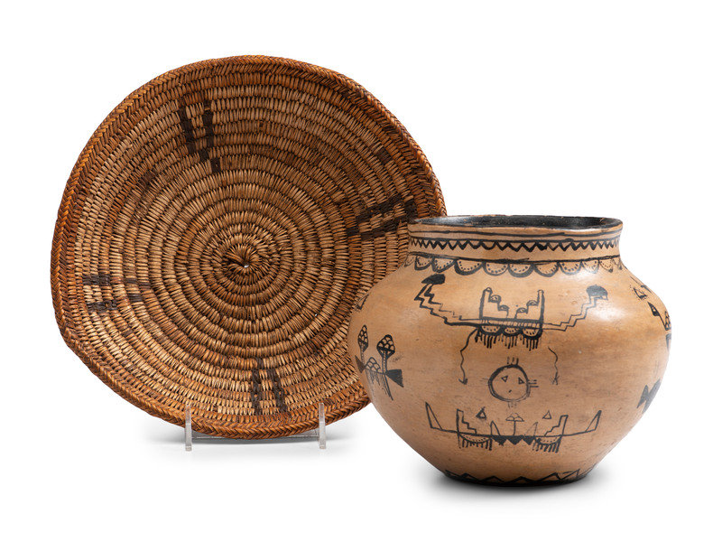 a graphic Cochiti jar, with imagery of rain and snow clouds, lightening, and the sun