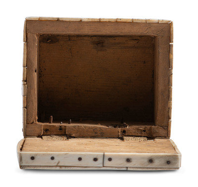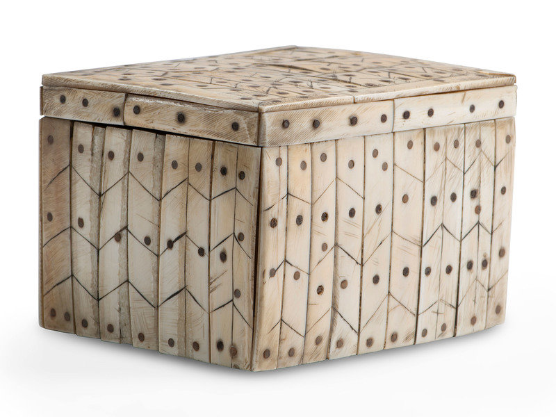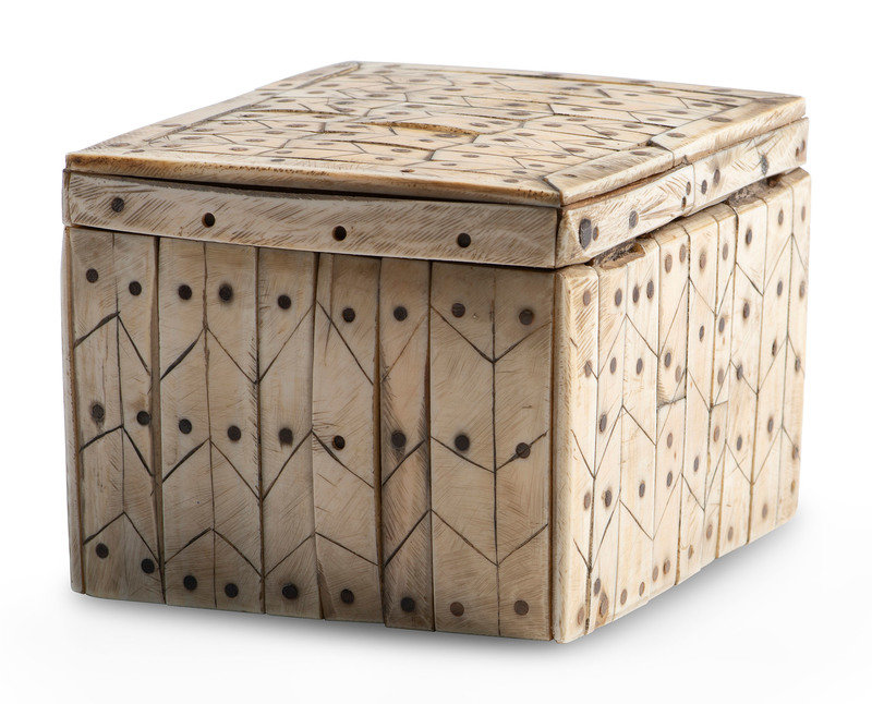 rectangular polished bone pieces having linear decorations are affixed to a wood box with small metal brads