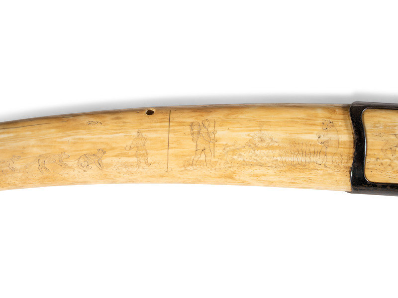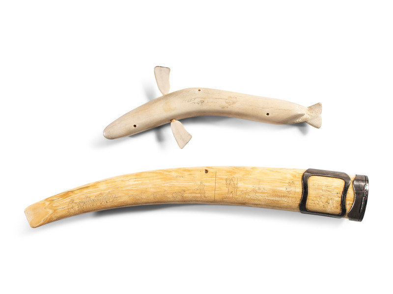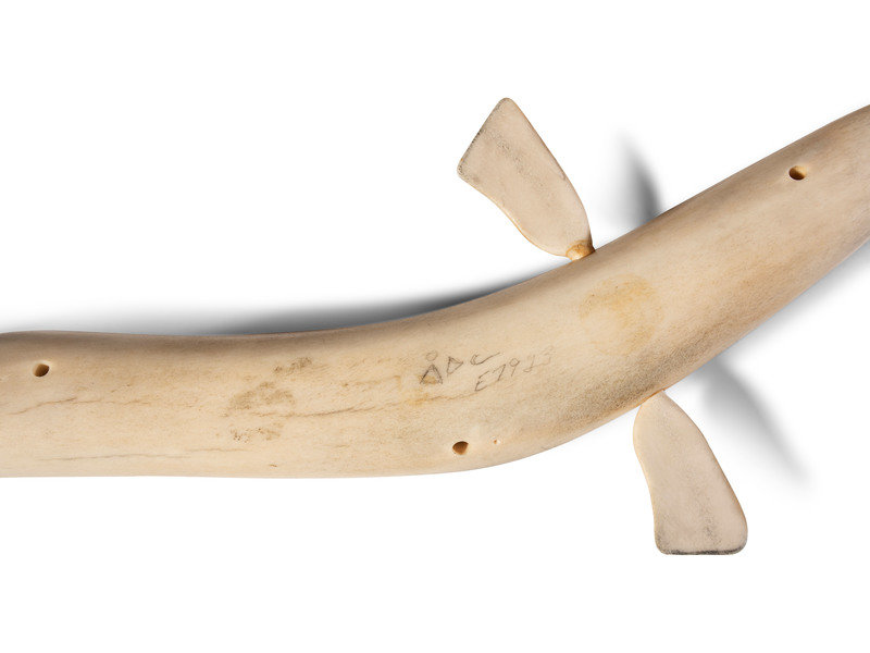 a carved antler board in the form of a whale; signed in syllabics and with disk number E7923