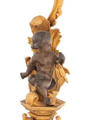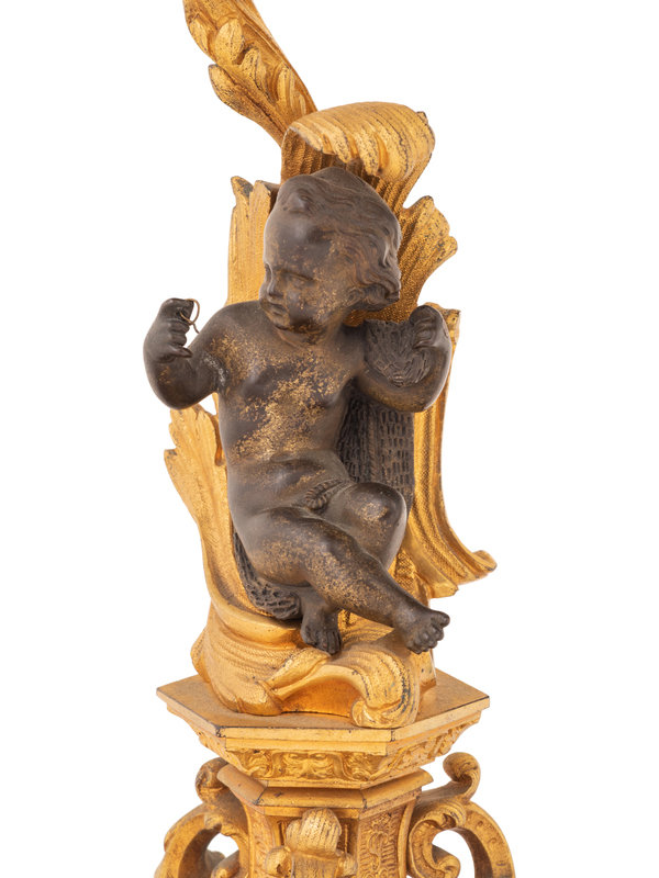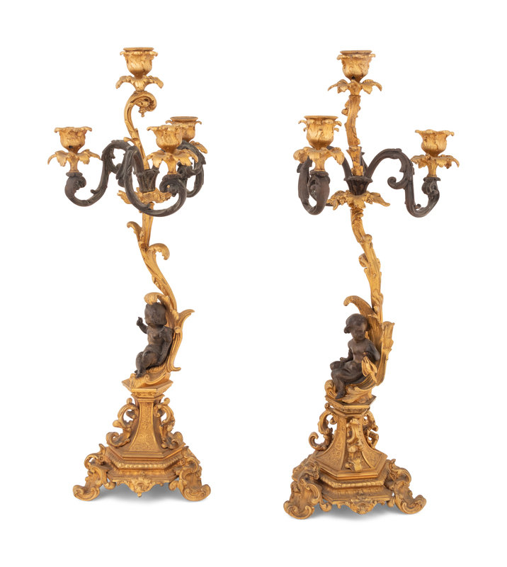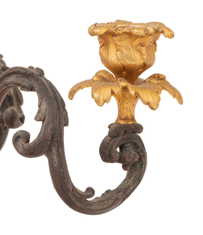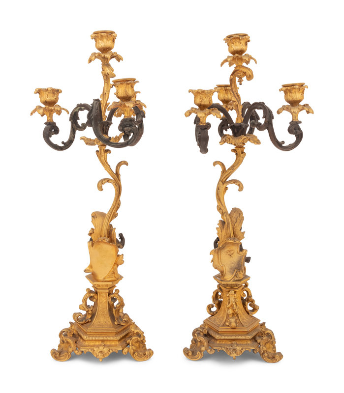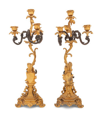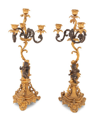 A Pair of Continental Gilt and Patinated Bronze Four-Light Candelabra