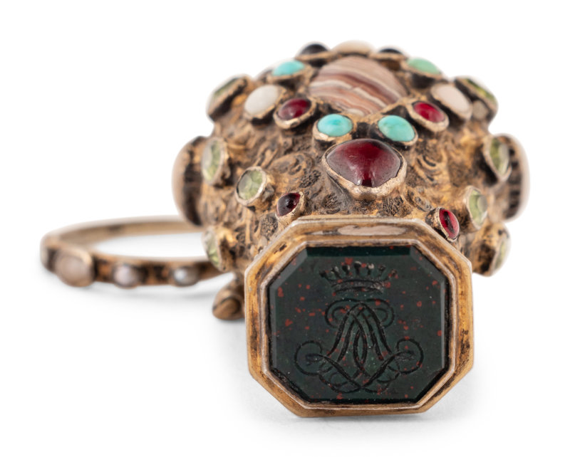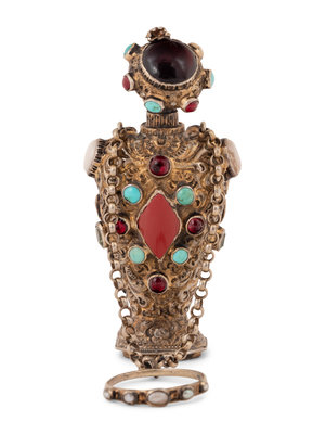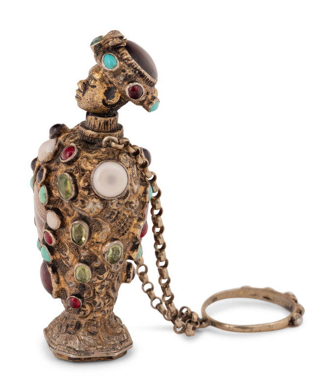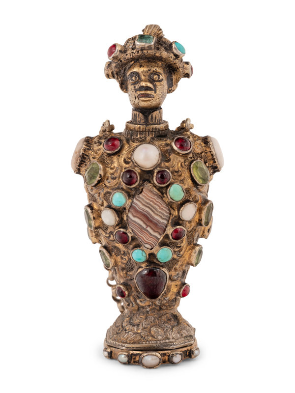 A Continental Jeweled Silver Figural Scent Bottle and Hand Seal