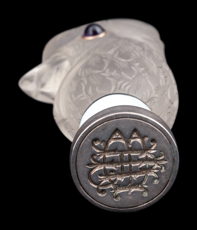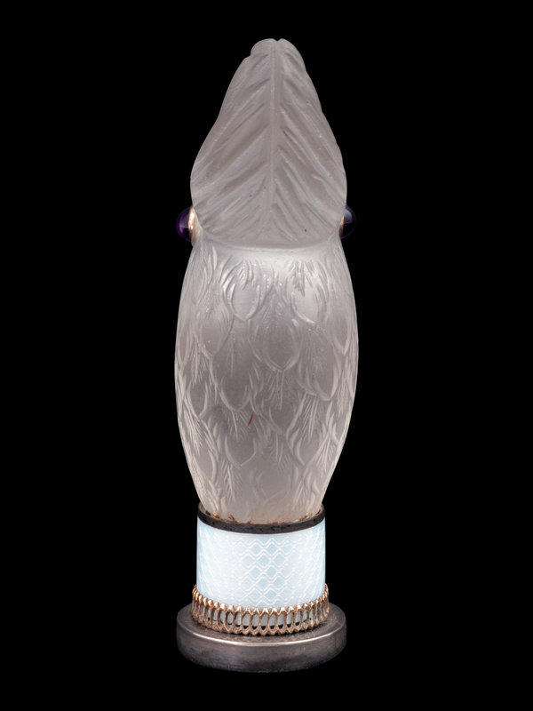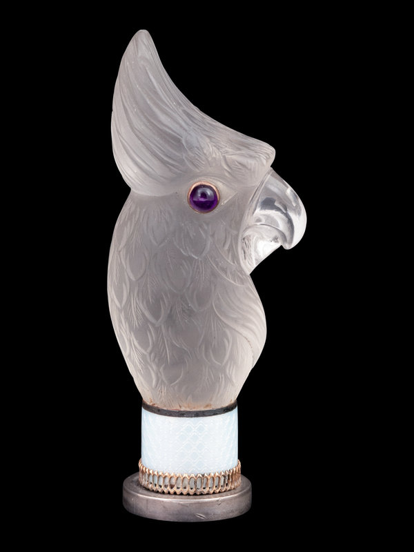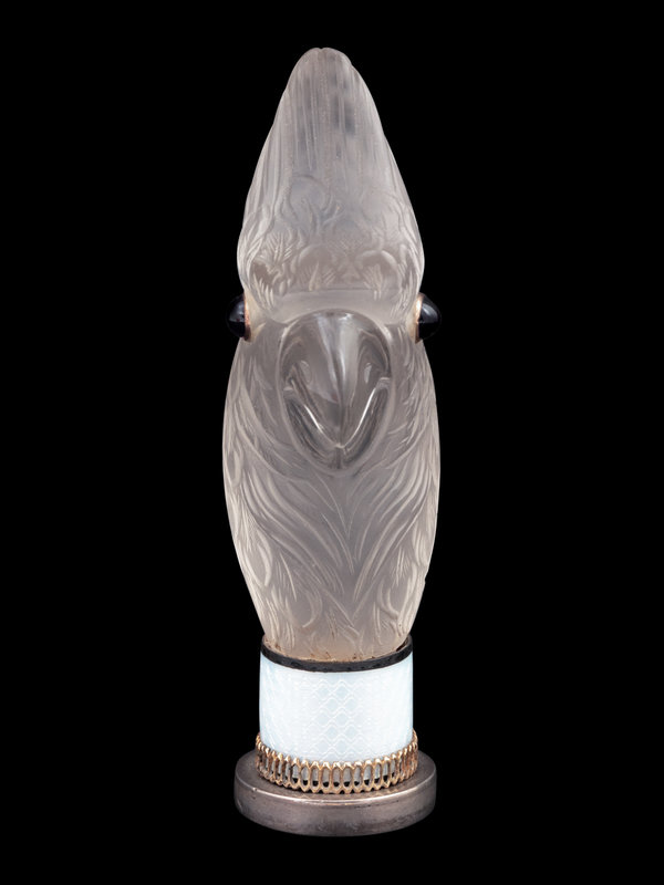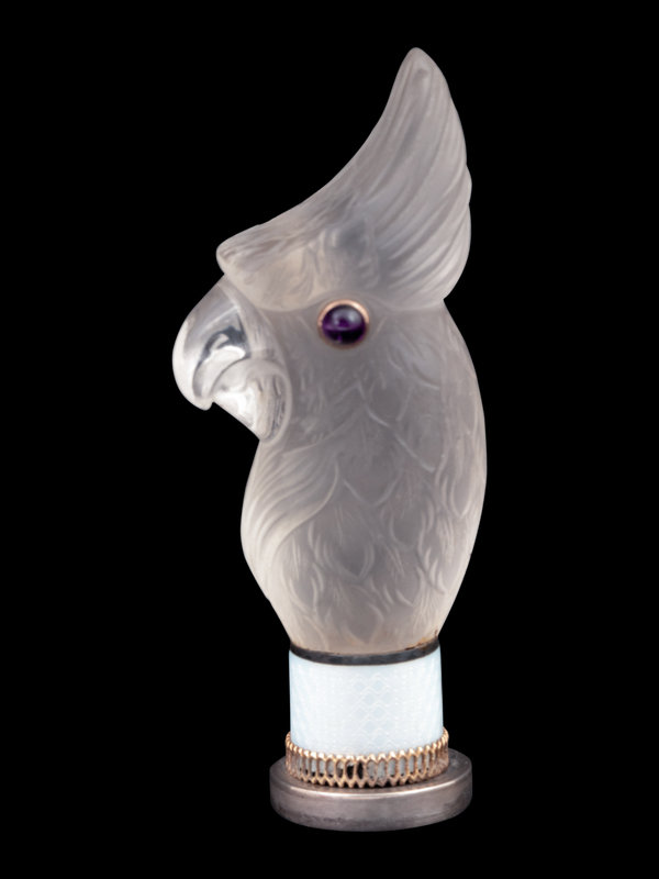 A Continental Carved Rock Crystal and Guilloche Enamel-Mounted Cockatiel-Form Hand Seal