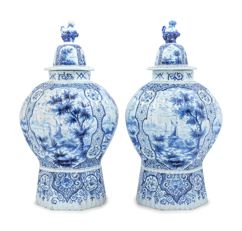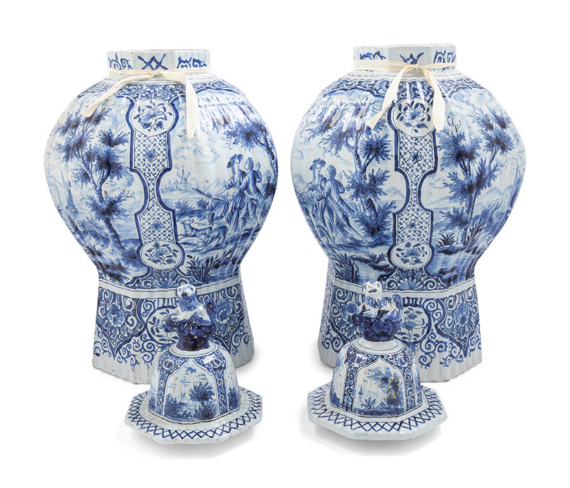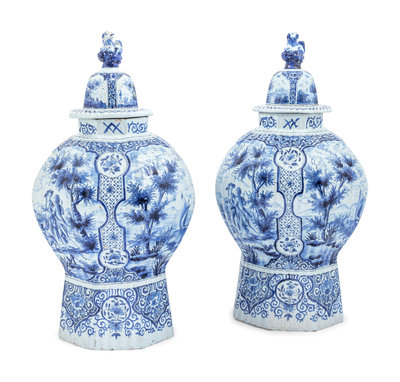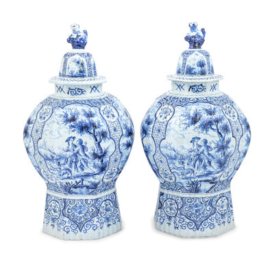A Pair of Large Delftware Vases and Covers