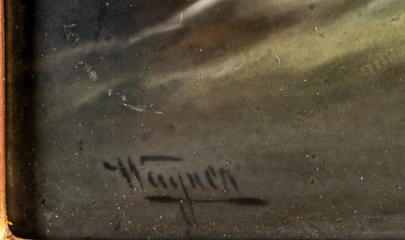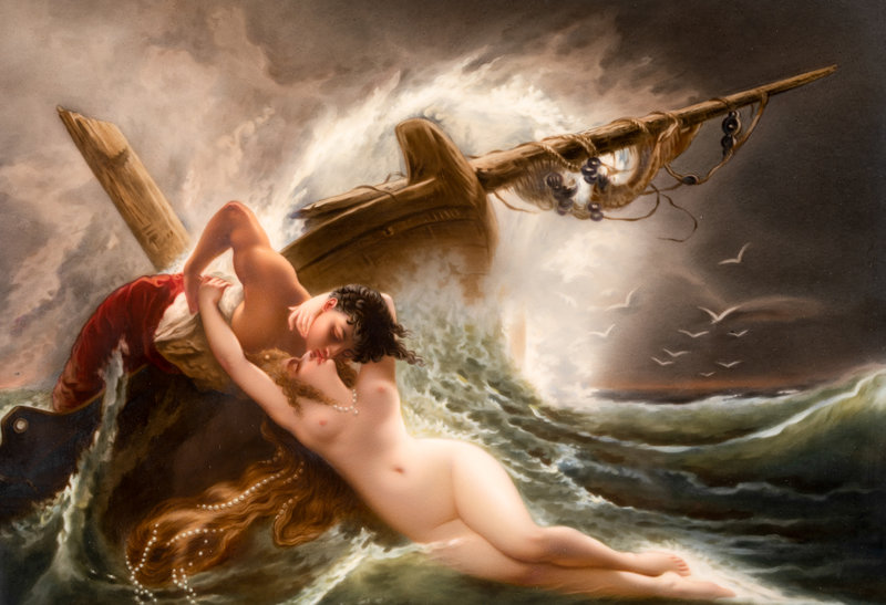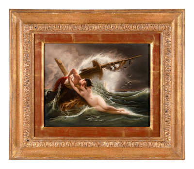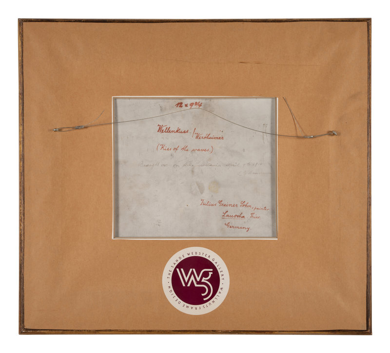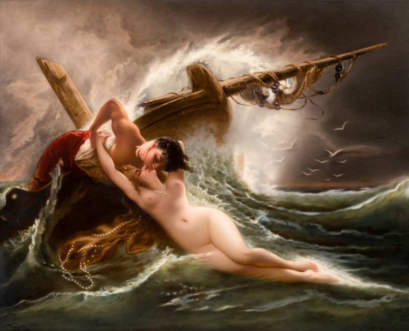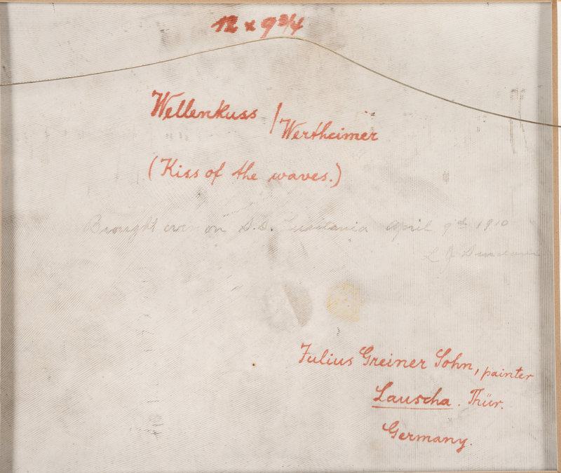 signed Wagner (lower left), bearing an impressed K.P.M. scepter mark and numbered 815 233, inscribed Wellenkuss/Wertheimer / (Kiss of the waves) and Julius Greiner John, painter / Lauscha Thür. / Germany in iron red script and inscribed Brought over on S.S. Lusitania April 9th, 1910 in pencil to the reverse.