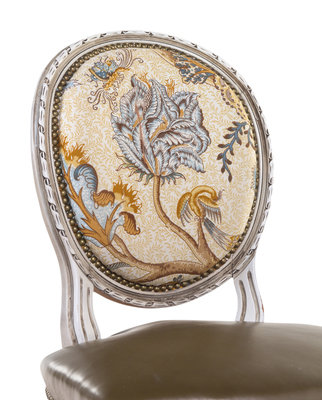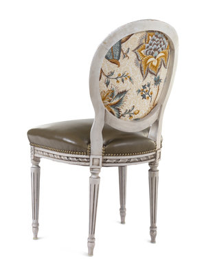 with green leather-upholstered seats, the backs with Pierre Frey upholstery.