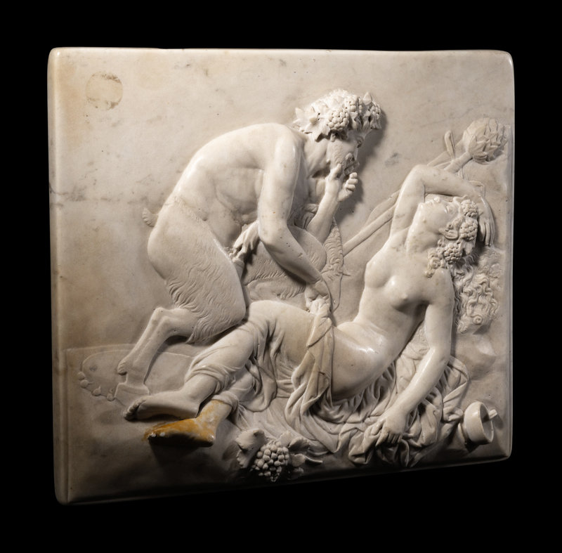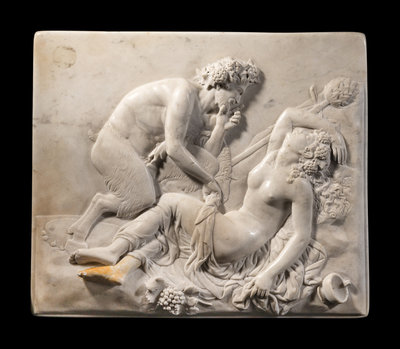 A Continental Carved Marble Relief Depicting a Satyr and a Bacchante