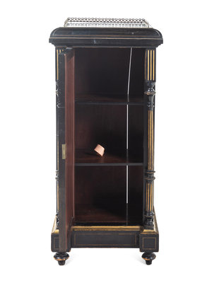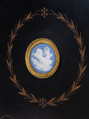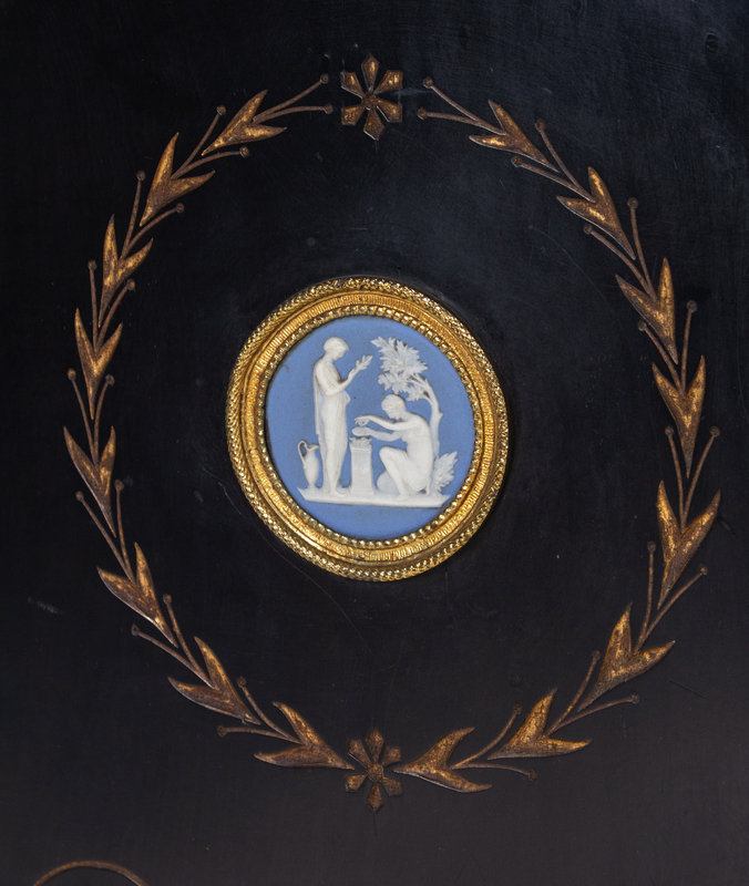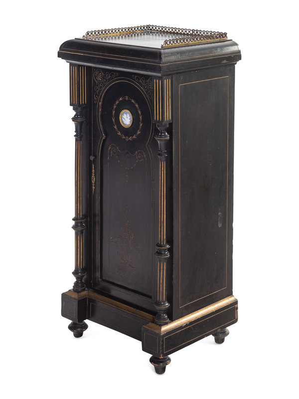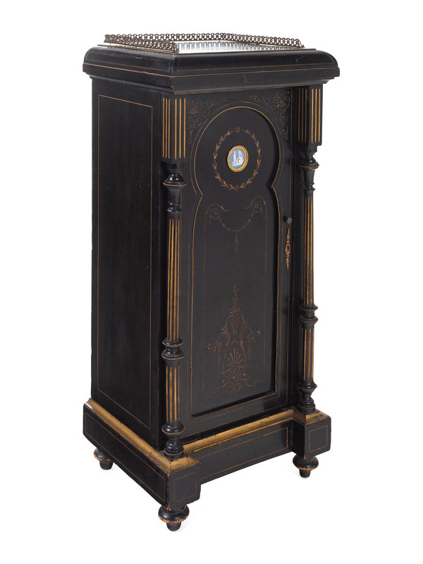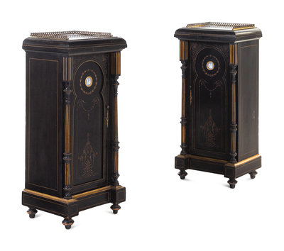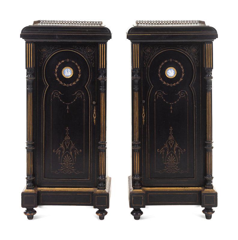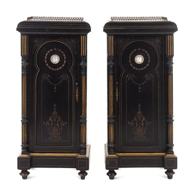 A Pair of English Aesthetic Jasperware Medallion-Mounted Ebonized and Parcel-Gilt Pedestal Cabinets