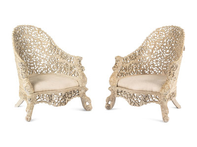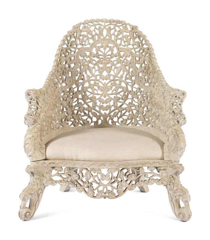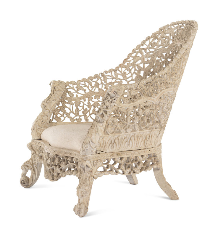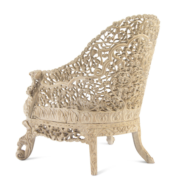 A Pair of Indian Painted Teakwood Armchairs and a Similar Table