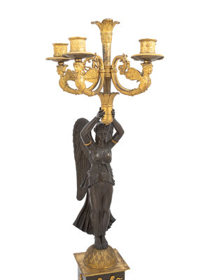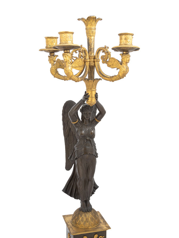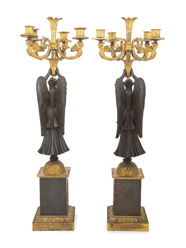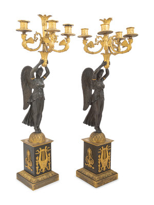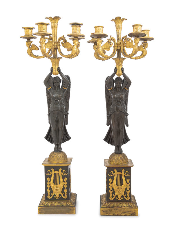A Pair of Empire Ormolu and Patinated Bronze Figural Five-Light Candelabra