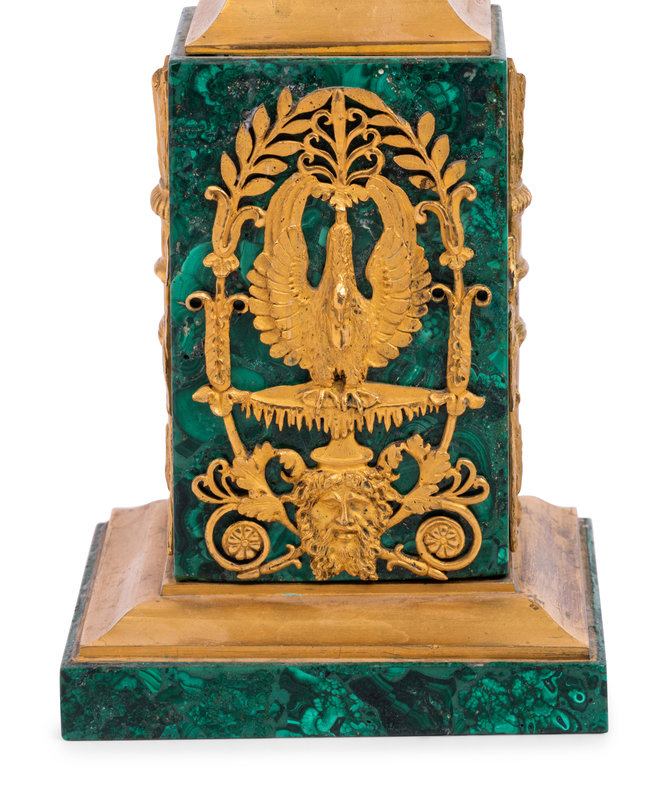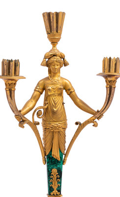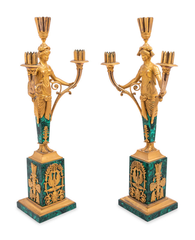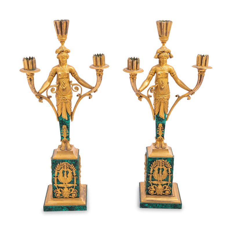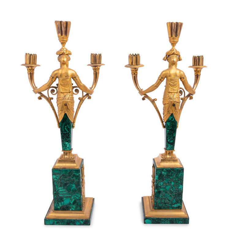 A Pair of Empire Style Gilt Bronze and Malachite Veneered Three-Light Candelabra