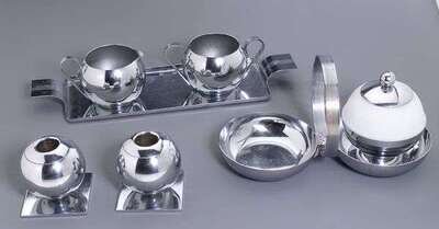 A pair of bubble candlesticks in chrome, h: 2 1/4 in.; a mint and nut dish in chrome with banded middle, designed by Ruth and William Gerth, l: 8 1/2 in.; a chrome and white frosted glass mustard jar, h: 3 7/8 in., all with stamped archer mark; together with a Revere chrome creamer, sugar and tray set, stamped mark.