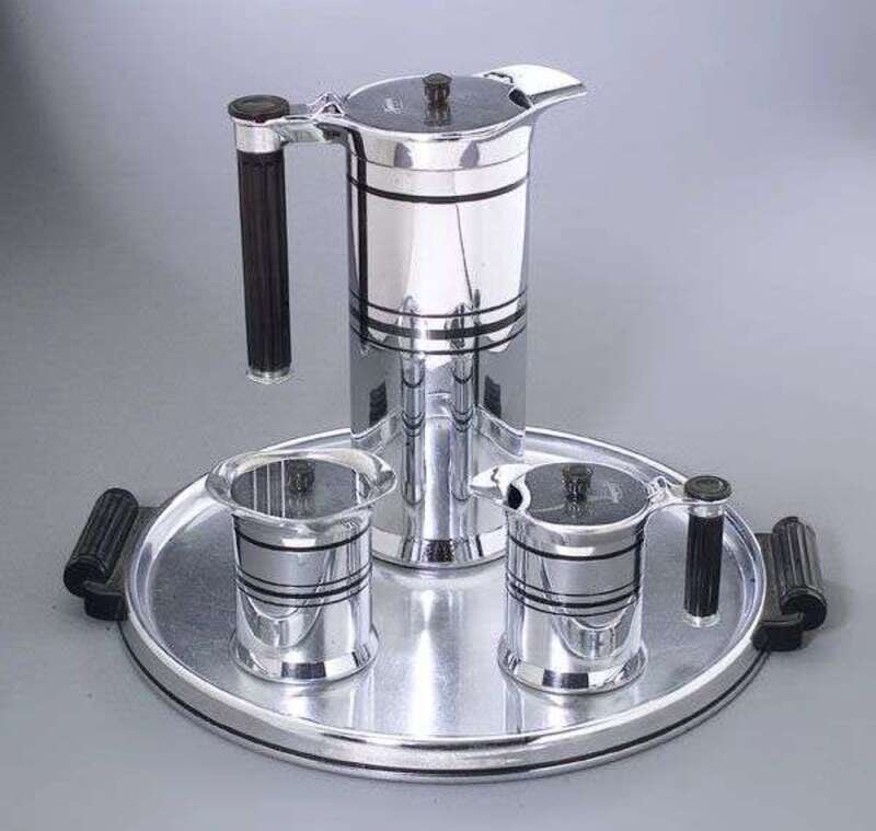 Including a pitcher, creamer, sugar and tray executed in chrome with black Bakelite handles and line inlay; height of pitcher: 9 1/2 in., diameter of tray: 14 in.