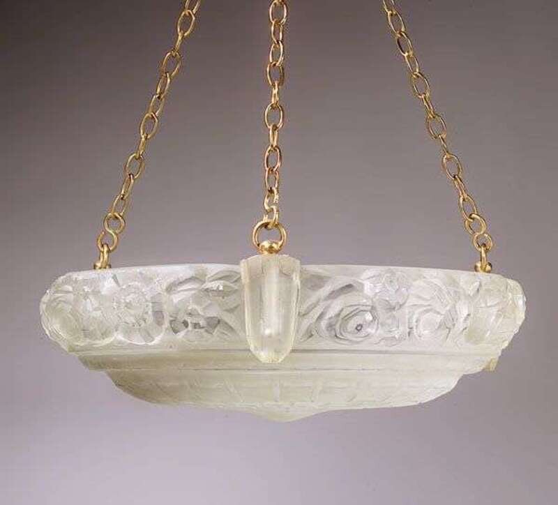 Each circular in molded frosted glass with blown out floral band and basketweave, molded "SABINO 4330 PARIS DEPOSE," new mounting brackets and chains, some chips, dia: 17, h: 5 1/4 in.