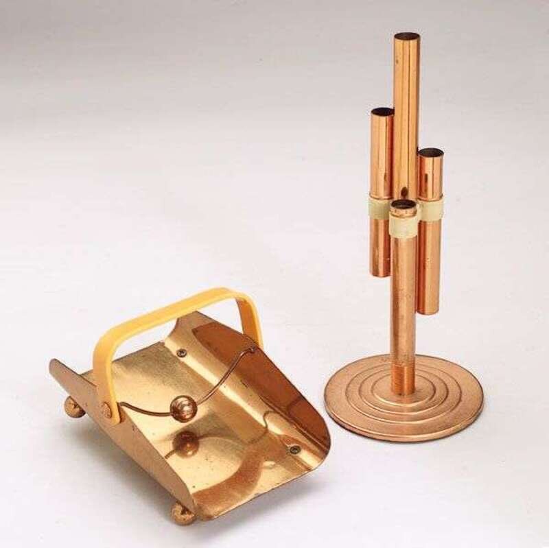 With four asymmetrically placed tubes joined by a Bakelite collar, on a stepped circular base, h: 9 in.; together with a copper napkin holder with orange Bakelite handle, designed by Harry Laylon, 3 1/2 x 6 x 4 in., stamped archer mark.