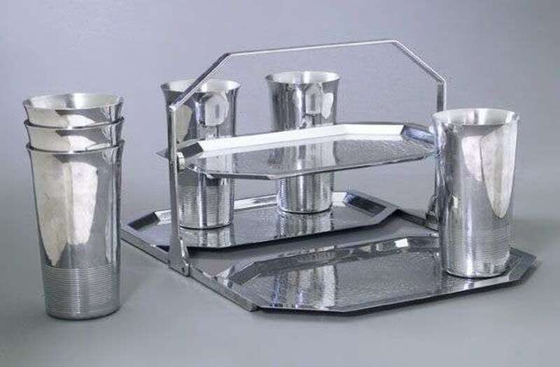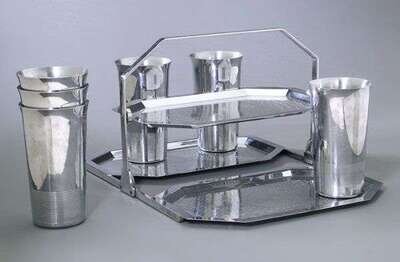A triple collapsible tray with scribed concentric design, h: 7 in. and six iced drink tumblers with scribed lines designed by Harry Laylon, h: 5 in.; stamped archer marks.