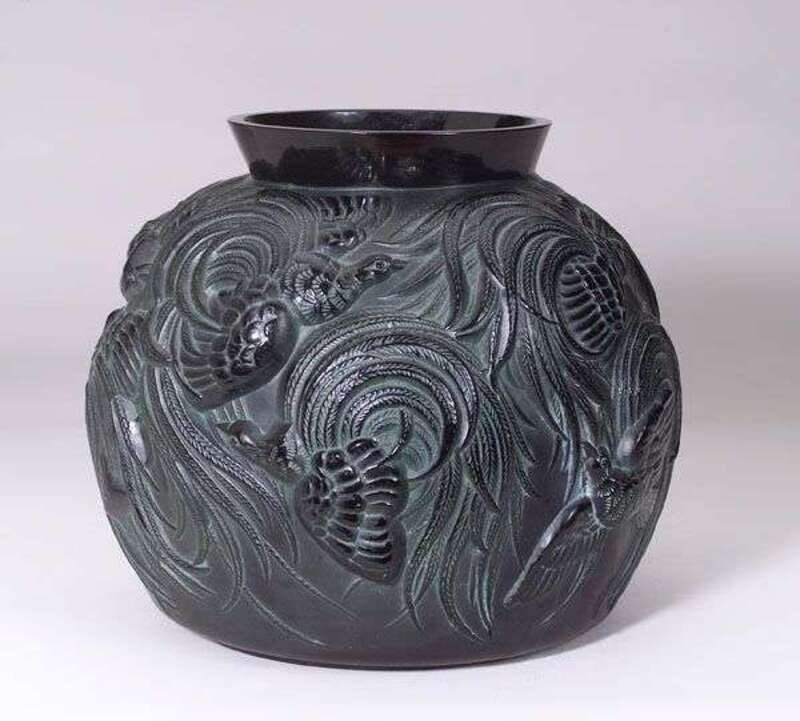 In black glass with green highlights and molded bird decoration, engraved "Sabino / Paris, Made in France," large crack, h: 9 1/2 in., dia: 11 in.