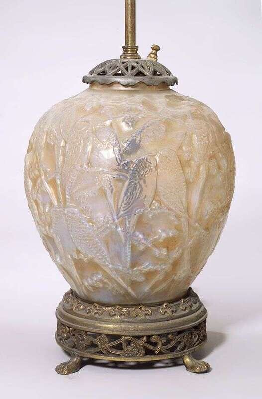 Of bulbous form, molded with lovebirds on tree branches in white opalescent glass, metal mounts and bird finial, "MADE IN CZECHOSLOVAKIA" sticker to glass, overall height: 29 in.