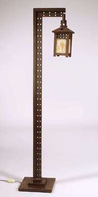 Recent manufacture, with rectilinear stand and arm having pierced square design suspending a lantern with slag glass panels and similarly pierced decoration, breaks to attachment, h: 64 in.