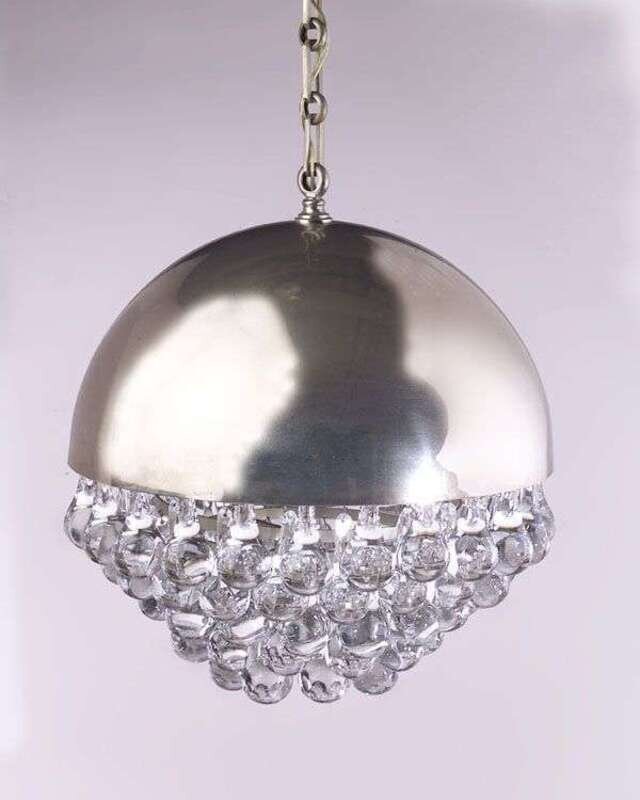 With nickeled bronze dome over an illuminated interior with stepped rows of 80 crystal teardrop pendants, stamped "BACCARAT [in circle] Bronze," dia: 16 in.