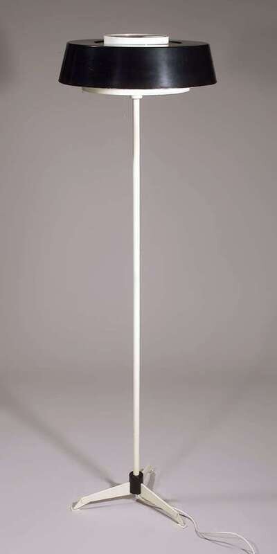 Black enameled metal shade, white enameled steel shaft and tripod base, h: 64 1/2 in.