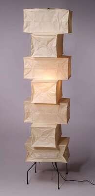Collapsible paper cubes on metal stand with adjustable legs, Noguchi signature with "Japan," h: 76 in.