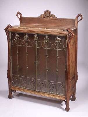 With carved sunflower pediment surmounting an oak pyrography frieze and marble top, the mahogany case with organically-carved strapwork and sides with oak pyrography floral decoration, twin glass doors, each with stylized floral decoration in wrought iron and enclosing a series of adjustable shelves, h: 62, w: 48, d: 18 in., some repairs.