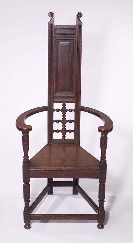 With tall carved and paneled back, flat curved arms, trapezoidal seat and turned legs, retains an upholstered seat pad (not pictured) and original finish, h: 51 1/2, w: 24, d: 19 in.