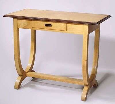 With maple top having molded mahogany edge, single drawer, U-form supports, and stretcher beneath, h: 30, w: 37 1/2, d: 19 1/2 in.