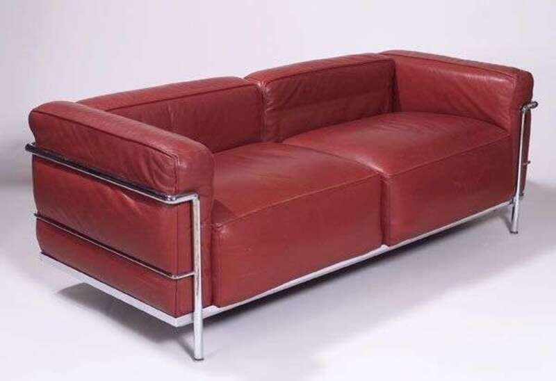 Polished chromed steel frame with Cassina burgundy leather cushions, Cassina tag, h: 25, w: 66, d: 29 in.