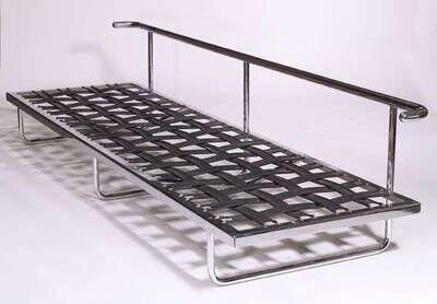 Designed 1935, with tubular nickel-plated steel back and legs on a rectangular steel frame woven with Pirelli rubber, Cassina stamp with number 91, lacking cushions, h: 22 1/2, w: 101, d: 29 1/2 in.